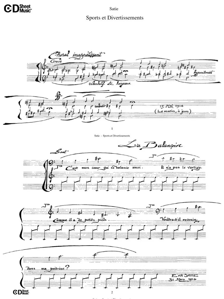 Mp3 • • • annoter cette partition... This work is a cycle of 21, consisting of a prefatory chorale and 20 musical vignettes depicting various sports and leisure activities. Erik satie composed 'sports et divertissements' in 1914.